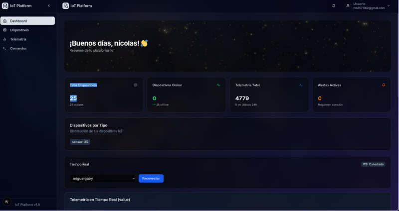 Sistema de monitoreo en tiempo real para dispositivos IoT. Backend robusto capaz de procesar streams de datos de sensores y visualizarlos instantáneamente para toma de decisiones.